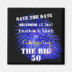 Save the date fridge magnet reminder with personalised name and date and blue fireworks.