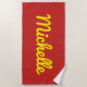This simple beach towel design feature a personalised name in a yellow script-like font on a red background.