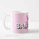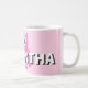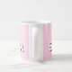 Personalised kid's mug with funny owl and name for girl. Cute gift idea for children's Birthday. Personalised mug design with little animal cartoon mascot. Custom girly pink background colour.