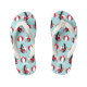 The product design features a pattern of a cute penguin standing with a red and white inner tube and beach balls with a light blue background. This pretty animal cartoon with personalised text makes cute and unique flip flops for kids.