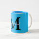 Personalise this blue two-tone coffee mug with any name/surname and single custom monogram.