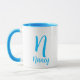 The design features customisable typography for name and monograph personalisation in an elegant light blue script font colour.