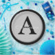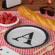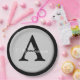 Personalise these silver metallic look button outlined in black round paper plates with any surname and single custom monogram.