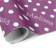 Personalised curved text name with white polka dot pattern print background in pretty grape purple colour. Great birthday gift wrap for women, girls or any lady!