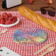 Bacon gift ideas. Bacon pattern with rainbow background, rainbow stripe personalised with your name gifts or monogram gifts or your initials. The best gifts for bacon lovers, chefs and cooks.