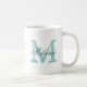 Personalised name typography monogram coffee mug. Vintage monogrammed coffeemug with stylish script letters. Cute birthday or wedding favour gift idea for me and women. Stylish cup with elegant teal blue colours. Available as big extra large oversized mug and to go travelmug. Double sided design.