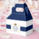 Love these personalised favour boxes for your nautical wedding, bridal shower favour gifts! Navy blue and white stripes with navy blue anchor. White banner all around. Gold foil glitter heart to add some touch of class. Add your text and customise it! Get matching invites and stickers! Found in 'NAUTICAL' wedding collection.