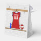 This personalised design can be created in any colour combination for the netball star in your family. Contact us through our GiftsBonanaza store with your request A unique design for the netball player or netball fan with a netball uniform hanging up in a sports changing room in red with blue and white trim. The name and netball position can be customised for the netball player. A netball and water bottle is next to the netball uniform.