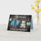 Celebrate the joyous moment with a personalised new baby boy greeting card. A rustic fence with baby boy blue clothing on a clothes line and the message, "Welcome" Add name for personalisation. Customise the inside with your own message and add baby's name and birth date onto the back.