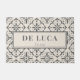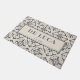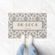 An elegant personalised newlywed couple doormat featuring a pretty diamond shaped stylised repeated floral pattern in grey and cream hues. Add character to your new home together with your name and date established.