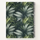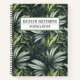 The image shows a spiral-bound notebook with a dark green background featuring a pattern of various green and white leaves. In the centre of the cover, there is a white rectangular label with a green border.