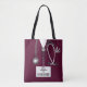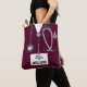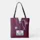 Unique medical nurse purse featuring maroon hospital scrubs, stethoscope and funny Swiss Army knife. To customise edit text to add name.
