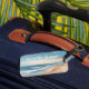 Beautiful painting of an ocean beach with rolling waves on a sunny afternoon and a couple walking on the sand- a perfect vacation spot! Personalise this luggage tag with with your own text.