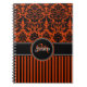 This monogrammed orange, black, and white damask with stripes pattern notebook has template boxes for you to add your name, monogram, or other text. If you need help customising this item, please email niteowlstudio@gmail.com for assistance.