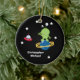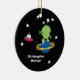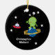 This round shaped ceramic ornament has an outerspace design. There is an alien standing on a planet with stars all around. A spaceship is also to the left. You can customise the name at the bottom. Zenware Designs