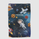 Featuring illustrations of outer space activities and icons as stars, a space rocket, an astronaut, moon, satellite, and other planet system elements.