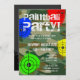 Personalised paintball party invitations | Custom invites for birthdays and other occasions. Personalizable announcement text and background colour. Targets and paint splatter design with neon colours. Camouflage pattern background design.