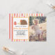 A cute, personalizable photo birthday party invitation with a red and orange striped background, featuring a hedgehog wearing a party hat with a strawberry cupcake.