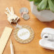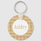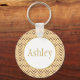 Stylish personalised keychain design features customisable centre name text with peach and gold chevron stripe background pattern.