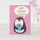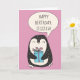Send some personalised birthday greetings with this cute penguin happy birthday card. It features an illustration of cute penguin holding a wrapped up present against a pink background. Use the template fields to easily create your own personalised message on the front and on the inside of this card.