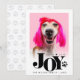 Spread JOY with this modern on trend stylish holiday pet theme photo card perfect for dog and cat lovers! Featuring your photo with the word JOY in a fun playful modern retro typography style and a realistic paw print on top. Add your photo and your personal message to this elegant fun holiday pet photo design and make it your own one-of-a-kind original holiday card. Matching paw print on snow pattern on back. PHOTO TIP: Pre-crop your photo BEFORE uploading and/or use the CROP tool in the PERSONALIZE section to adjust placement within the template area. For help with design or personalisation or transferring design to another product, contact designer BEFORE ORDERING via the Zazzle Chat MESSAGE tab below or email thepetstarofficial@gmail.com. For more fun follow @petstarofficial on Instagram and Facebook © Marisu Valencia - All Rights Reserved