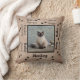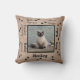 Personalised throw pillow of your dog or cat. Customisable with their photo and name. When you change the name to your own pet's name it will change all the names at the same time. Different font styles in black with paw prints that walk around the edge. The background is a rustic tea stained tan linen look. It is completely customisable. You can change the font styles, sizes and colours.