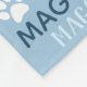 Blue Personalised blanket for your dog. Customisable with your dog or cat photo image with your dog or cat's name. When you change the name Maggie to your own pet's name it will change all the typographical names at the same time. Word cloud art typography. Different font type and styles in light blue, navy blue and white with paw prints.