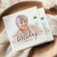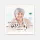 Modern birthday party napkins featuring a custom photo. Easily replace the sample image with a photo of the guest of honour. The word "birthday" appears in elegant black handwriting script. Personalise the text with the name and birthday year in black sans serif font. A white gradient overlay helps make the text pop.