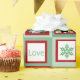Add four medium-large personalised custom digital photos to this festive classy square jumbled frame shape picture frame wrapping paper that says "love and joy" with light and dark shades of grey, red and green.