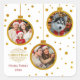 The design features: Three customisable photo frames styled as hanging Christmas ornaments (gold circles).