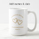 Add the couple's names and photo to this stylish golden 50th wedding anniversary mug. The golden tan simple, modern script is not real foil but faux gold. All the elegant typography is editable. Personalise this special photo keepsake coffee mug with the couples names and wedding anniversary date for a beautiful wedding anniversary gift. "Celebrating 50 Years" can be customised to any number for a 60th, 40th, 25th or any anniversary year. I created these hand drawn hearts for your keepsake 50th wedding anniversary gift. The two unique copper golden hearts created with impressions of leaves and buds, add a romantic botanical touch. This would be a great party favour for a golden 50th anniversary party. The table would look great with these commemorative cups and my golden heart napkins and coasters. Explore my collection for matching etched wine glasses, napkins and coasters for easy, yet stylish and unique custom party decorations.