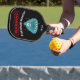 Custom designed with fun colours, this pickleball paddle exudes performance and power with a black background and a cute blue/green pickleball monster. Personalise with your name. Great gift for any pickleball player - Christmas, birthday, anniversary, or just to make someone feel special.