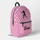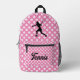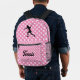 Personalised pink backpack with tennis ball print and female silhouette of a tennis pro. Custom colour backpack for tennis lover, fan, player, coach etc. Cute design with custom name or monogram. Cool Birthday gift idea for kids going back to school.