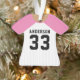 Celebrate your baseball star with this personalised pink and white pinstripe jersey ornament. Perfect for commemorating a special season, player, or team. Customise it with a name and number to create a unique keepsake.