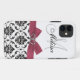 This monogrammed pink, black and white damask iPhone 5 Case-Mate Case has a photo of this design embedded into the hard plastic cover. The design is made up of a black and white damask pattern, a print of a pink bow and ribbon with two hearts with diamonds and a blank area where you can add your name and monogram initial in gorgeous script fonts. This iPhone 5 case cover is the perfect way to accessorise your iPhone 5. Be stylish and girly all at the same time. Design by Elke Clarke©2012. Graphics licensed for use.