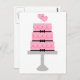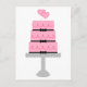 Pink, three-tiered cake with black ribbon and bows; sitting on a silver cake stand with hearts on top