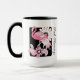 The product design features a flamingo with kaleidoscopic paisley patterns in shades of pink. This tropical bird original whimsical illustration makes a girly cute and unique coffee mug with personalised text.