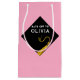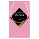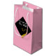 Graduation gift bag featuring black and gold grad cap on pink background. Edit text to add name of graduate.