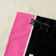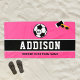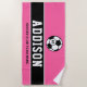 Personalised soccer themed beach towel design for kids and teens features a soccer ball customised with the player's uniform number, custom text for the player's first or last name, and modern text for the soccer club team name. Makes a unique favour gift for tournaments and pool parties with the team! Stylish and modern design features sporty varsity jersey lettering and simple horizontal stripes. The colour scheme of hot pink, black and white can be modified to coordinate with your team colours.