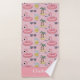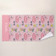 This summer-themed bath towel design is complete with a seamless pattern of flamingo pool floaties, pitchers of lemonade, sunglasses, and palm trees set against an light pink background. There is a place to add your name at the bottom of the towel.