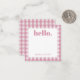 Personalised stationery enclosure notecard with a pink gingham pattern in notes of dark deep and vibrant rose pink bubble gum and white with the sentimental words "hello". Tuck it into a flower bouquet or meaningful gift. These minimal flower shop inspired enclosure cards bring a retro kitchen vibe to your most thoughtful moments.