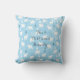 Personalised Christmas throw pillow featuring cute polar bears with falling snowflakes on an ice blue background with the family name and year in a classic bluey-grey font. The reverse features Merry Christmas in a script white font on a matching ice blue background.