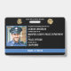 The customisable police department ID badge features a police emblem at the top that can be customised to your department as well as a place for the state logo as well. Customise with the officer's photo on the left. Beside the photo, the officer’s name, badge number, rank, and department are displayed. Add your own barcode to the back of the card, along with issue and expiration dates, and description of the officer, captain, chief, or office employee.