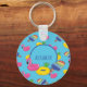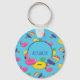 Create a unique personalised gift that's perfect for your favourite swimmer. This keychain features a pattern of brightly coloured pool floats or pool tubes in the shape of a flamingo, a pineapple and a popsicle against a bright blue background. Use the template field to easily add your name to this pool party themed keychain.