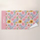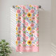 This flower bath towel design is complete with a pretty seamless pattern of pink flowers, blue flowers, and sunflowers on a white background as well as a place to add your name.