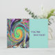 Customised abstract vortex swirl design party invitations or announcements. On the left side is a funky abstract design in lots of bright, neon colours, including oranges, golds, blues, greens, purples, and pinks. The design looks like a spiral vortex against a bright multicolor background. The left half is in matching light blue background with matching purple letters. Funky retro psychedelic all-occasion design is perfect for other special occasions, too- showers, bachelorette parties, and such. We also have this abstract design on other office supplies and funky gifts. Just visit our online Zazzle shop for lots of other abstract designs. "You're Invited" is printed on the front of these birthday invitations or announcements in coordinating purple letters against a matching light blue background, which can be changed. The customised, coordinating colours on the back may also be changed. Enter your own personal information on the back. Change the background or text colour, font style, or wording if you like.
