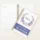 This customisable planner has a white background with a wreath of watercolor flowers, leaves, and vines in pastel shades of mauve, pink, lavender, purple, and green. There is a purple and lilac band across the bottom with white customisable letters that say, "Jennifer Matheson's Planner" on it with "2022" in purple inside the wreath that can be customised to whatever name and year you want.