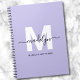 Personalised Elegant Modern Light Purple Script Name Initial Monogram Spiral Notebook. This simple and girly notebook features a soft light purple background with a clean white initial that pairs beautifully with a hand-lettered black script name. Below the initial, the full first and last name is printed in a sleek, modern font, creating a polished and feminine look.