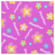 Bold flower named repeat patterned fabric in bright purple, pink, yellow, aqua and white. Ideal for sewing projects for girls. Customise with your own choice of name currently reads Heather. The background colour can also be changed if required. Design is produced to tie in with other products from this range. Original art and design by Sarah Trett.