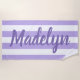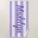 Personalised beach towel design features custom text in modern purple script that can be personalised with a first or last name against a pattern of white stripes on a light purple background. Colours and font style can be completely customised.